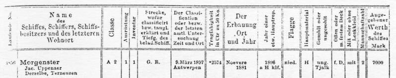 Afbeelding 7. Voorbeeld uit het Rijnschepenregister van 1898. Jac. Oppeneer uit Terneuzen had in dat jaar de houten otter Morgenster overgenomen van Bastianus Wilhelmus Touw (1841-1906), mijn overgrootvader. Het schip werd beschreven als zijnde een tjalk.