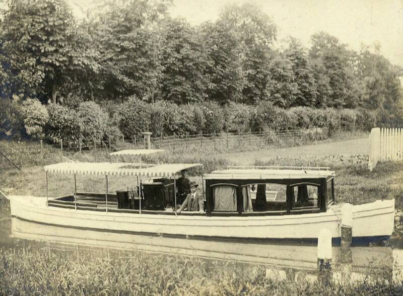 Afbeelding 8. Anoniem 1904/05. Voorbeeld van een luxe motorboot begin twintigste eeuw. [Directiemotorboot Oog in Al, de Vleutense Wetering langs de Kanaalweg te Utrecht. 1904-05 tijdens bouw 2e schutsluis op het Merwedekanaal bij Utrecht. Cat.nr. 125928 Beeldbank (Het Utrechts Archief.] De Oog in Al is in 1904 gebouwd op de werf “Nicolaas Witsen” van firma W.F. Stoel & Zoon te Alkmaar voor Rijkswaterstaatwerk bij Utrecht.