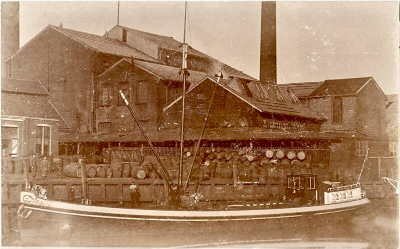 Afbeelding 34. Motorschip Advendo III bij de Spiritusfabriek te Bergen op Zoom. Foto anoniem. Datering: Het schip oogt nieuw, de foto kan 1904/05 gemaakt zijn. (Foto beschikbaar gesteld door Bert Zwikker, een achterkleinzoon van Hector Vermeulen.)