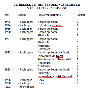 Van de 36 schippers die zich tussen 1905 en 1931 te Halsteren lieten inschrijven kwamen er negentien oorspronkelijk uit Bergen op Zoom. Dertien van hen kwamen rechtstreeks uit Bergen op Zoom, de anderen waren eerder in Dordrecht gedo-micilieerd. Dat veel schippers uit het nabije Bergen op Zoom afkomstig waren, mag niet verwonderlijk heten.