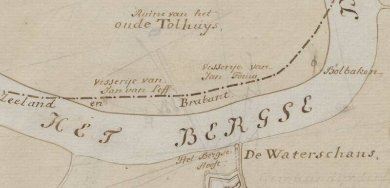 Detail van bovenstaande kaart. De visserij van Jan Touw (1764-1846) bestaat eigenlijk uit twee weervisserijen. Zijn buurman Jan van Leff (ook Waleff) telt er vier. Op de kaart staat geschreven dat deze twee visserijen 'haere vleugels' zich gedeeltelijk op Zeeuws gebied uitstrekken.