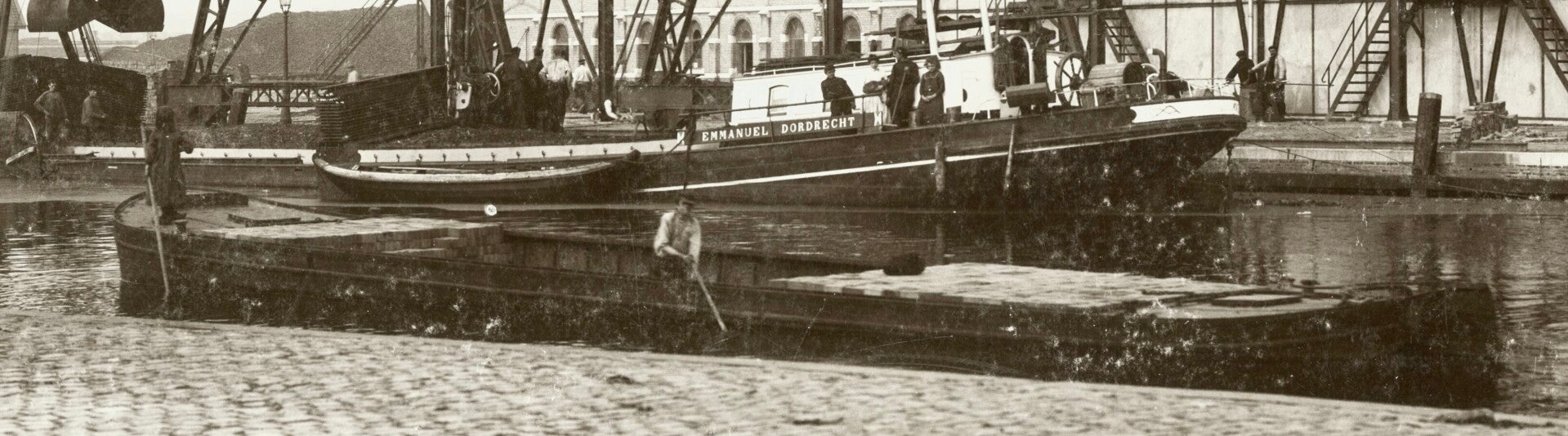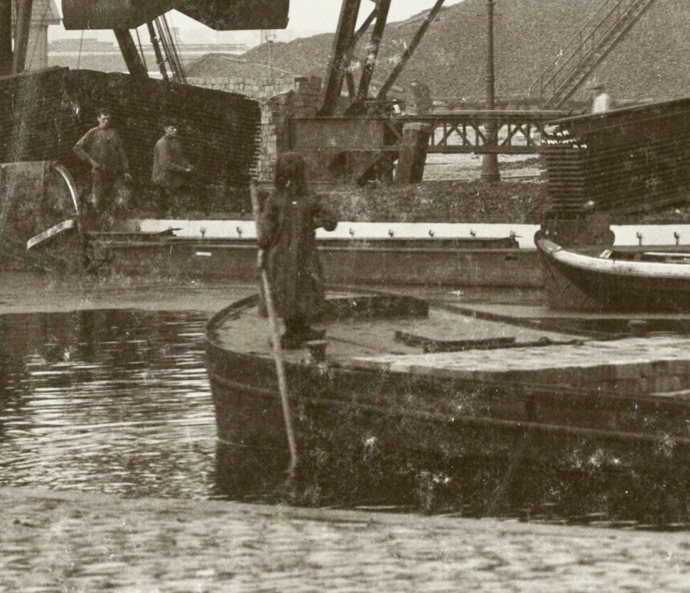Aan de overkant ligt omstreeks 1910 de Emmanuel uit Dordrecht kolen te lossen bij de gasfabriek in Den Haag. Maar het gaat hier om wat er op de voorgrond gaande is. Een open ijzeren schuit geladen met bakstenen drijft voorbij. Voortgeboomd door een man en een meisje. Vader en dochter? [Detail van een grotere foto. Foto anoniem. Datering ca 1910. Beeldcollectie Haags Gemeente-archief, Iden.nr. 0.70174]