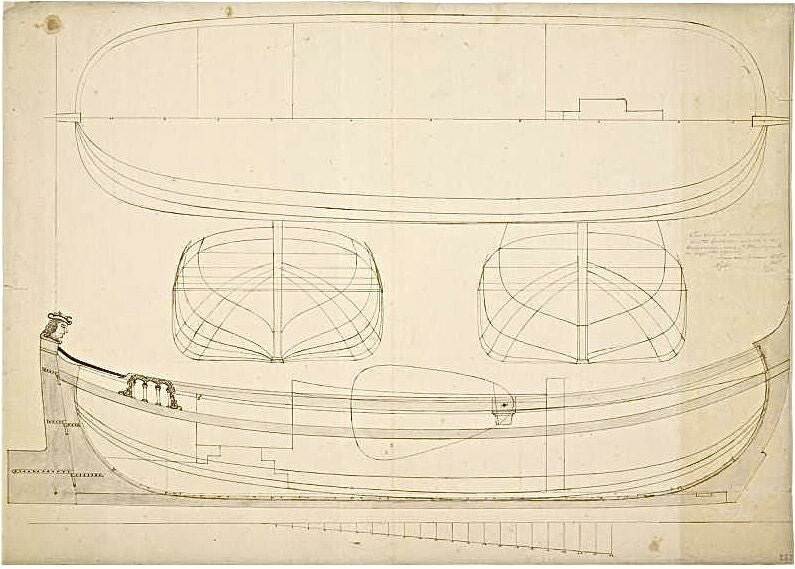 Collectie MMR T257. Pentekening van een spantenplan van een poon. Maker J.Vlaming. (1755-1765). Schaal; 1 (voet?) op 1.5 cm.