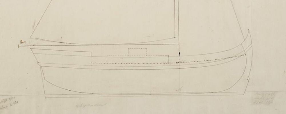 Detail van een anonieme technische tekening. Collectie Maritiem Museum Rotterdam T1460. Omschrijving: Een spiegeljacht. Zijaanzicht van een kotter.