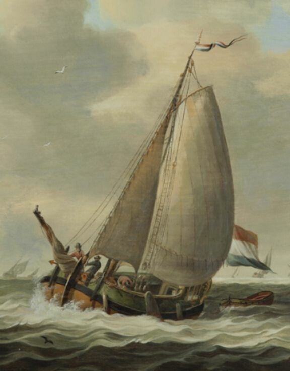 Er bestaat een schilderij van dezelfde kunstenaar. Goed, denk je, daar zeilt een poonschuit. Maar dan kijk je wat beter naar wat er te zien is onder het grootzeil. Juist, precies een zelfde paviljoen als op de prent van het spiegeljachtje.