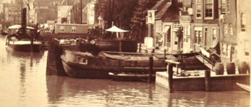 Afgetuigde paviljoenpoonschuit. Detail van een grotere foto beschreven als: Nieuwbrug, Voorstraatshaven. 1889-1891.Collectie Dordracum Illustratum, inv.n. 551_50055
