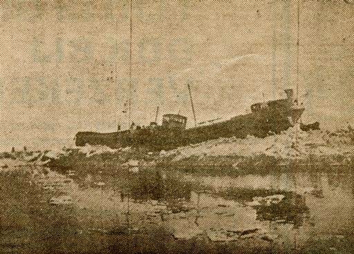 Foto uit De Scheepvaartkrant dec. 1985, Emmerich. Twee ledige schepen 'Madonna' en 'Mathilde' 5 a 6 m. boven water en op de wal, winter 1929.
